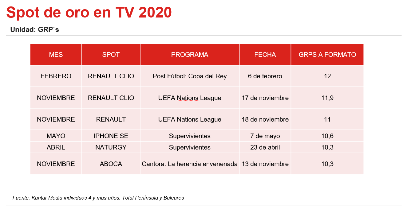 Renault ha conseguido las tres primeras posiciones del Spot de Oro gracias al fútbol. El primer puesto del año 2020 lo consiguió Renault Clío el 6 de febrero, en el post partido de la Copa del Rey con 12 GRP´S a formato. El cuarto puesto lo ocupa el spot de IPhone SE, emitido el 7 de mayo dentro del programa de Supervivientes, cuando consiguió 10,6 GRP’s. Este mismo programa le proporciona a Naturgy la quinta posición, el 23 de abril, con 10,3 GRP’s.