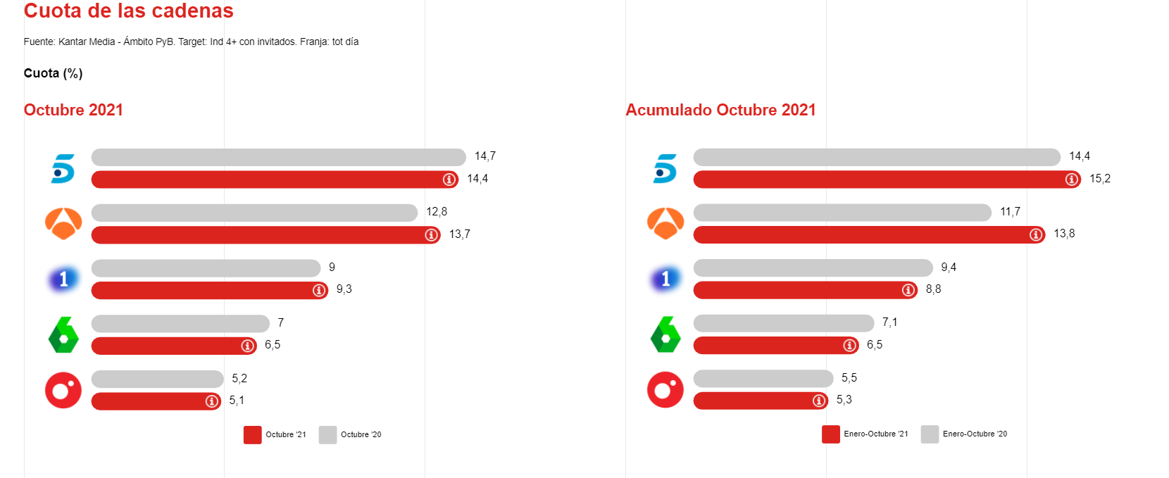 En los datos de cuota por cadenas del mes, Telecinco recuperó la primera posición con un 14,4% de share. Antena 3 bajó a la segunda plaza con un 13,7% de cuota de pantalla, pero con una evolución de un 7% si se compara con octubre de 2020. La 1 fue tercera con un 9,3%.