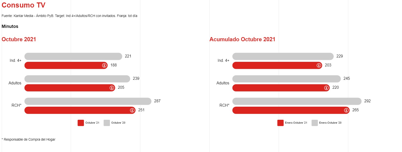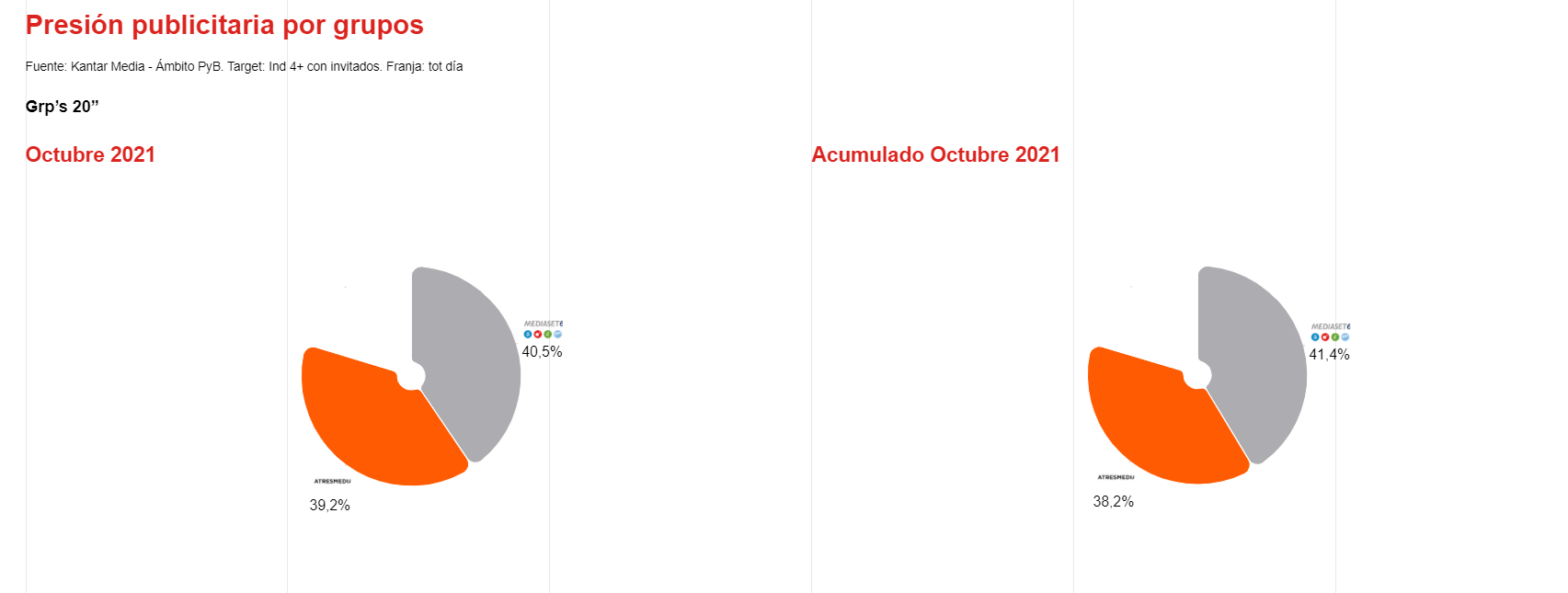 En lo que respecta a los datos de presión publicitaria, los tres targets reducen un poco sus resultados respecto a octubre 2020, pero no así frente al acumulado anual. En este caso se registran mejoras en RCH (+6,08%), Adultos (+5,03%) e Individuos 4 + (4,46%).