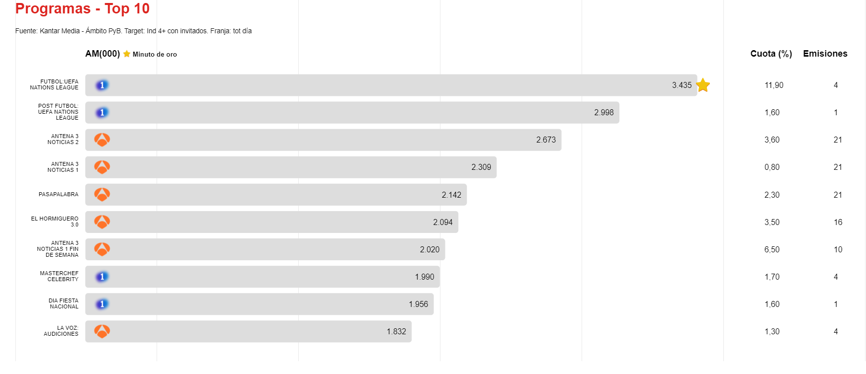 El fútbol vuelve a ocupar el primer puesto entre los programas más vistos del mes. La final de la UEFA Nations League, que enfrentó al combinado nacional entrenado por Luis Enrique con Francia, obtuvo en La 1 una audiencia media de 3.435.000 personas y una cuota del 11,9%. El Minuto de Oro se produjo a las 22:35:00 con algo más de 7 millones de espectadores.