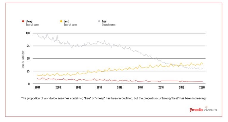 Sin embargo, es necesario captar a nuevos usuarios en la parte superior del funnel y atraerlos a la órbita y el territorio de la marca generando vínculos mas emocionales más allá de los racionales. Google es un buen ejemplo para confirmar cómo la búsqueda de valor está cambiando: las relacionadas con productos ‘baratos’ o ‘gratis’ tienden a decaer, mientras que las vinculadas con `mejor’ se incrementan.
