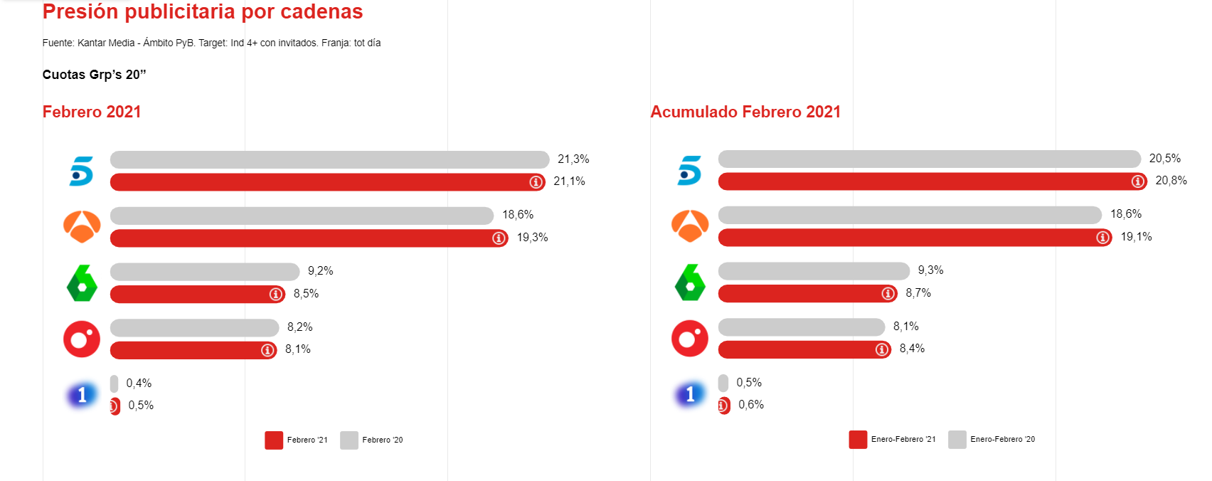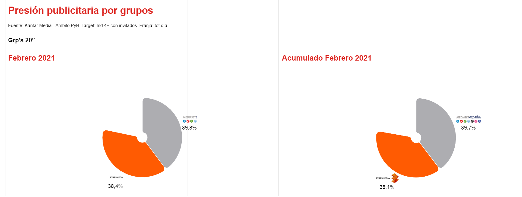 Los principales grupos comerciales se han visto afectados en el segundo mes del año en términos de cuota de presión publicitaria: Atresmedia se mantiene con un ligero descenso del 0,8%, mientras que Mediaset pierde un 5,8% respecto al año 2020.