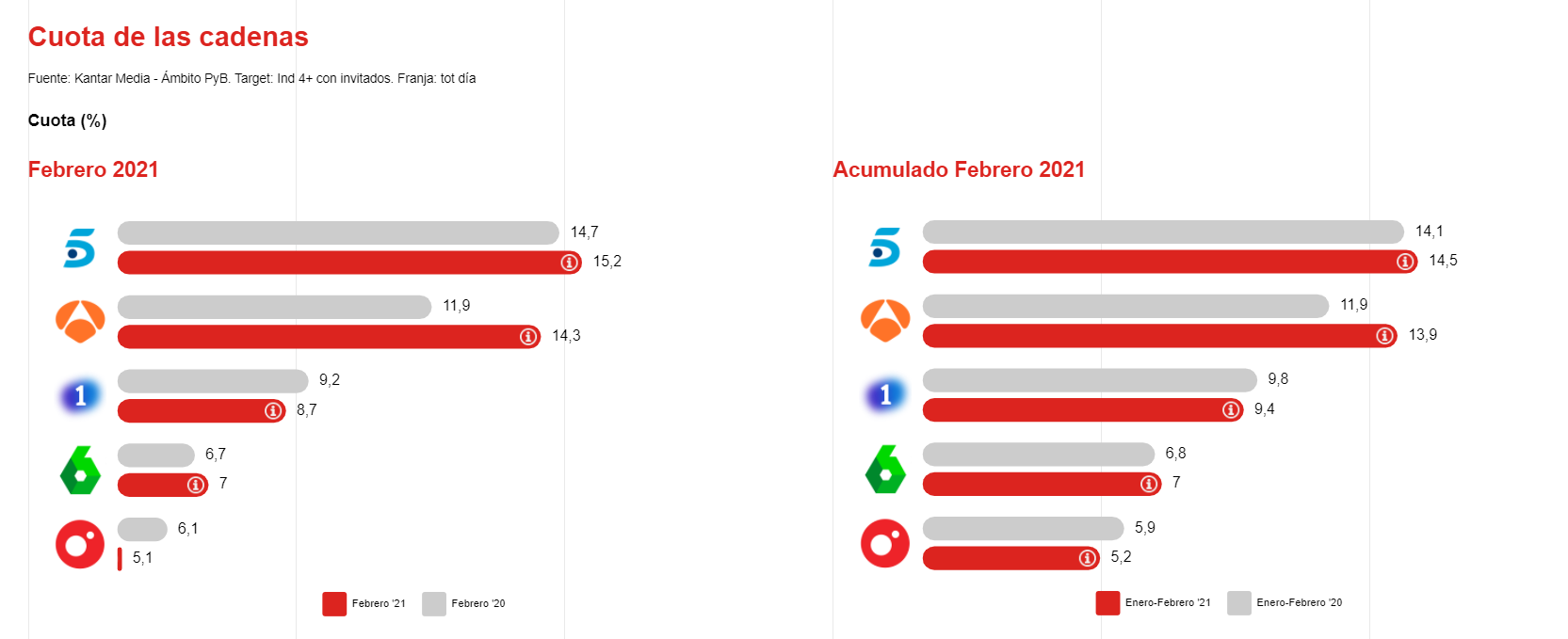 La lectura de cuota de las distintas cadenas confirma el liderazgo de Telecinco, con un 15,2% de share, seguida de Antena 3, con un 14,3%. Esta última incrementa de manera significativa sus datos con una subida del 4% frente al mismo mes de 2020.
