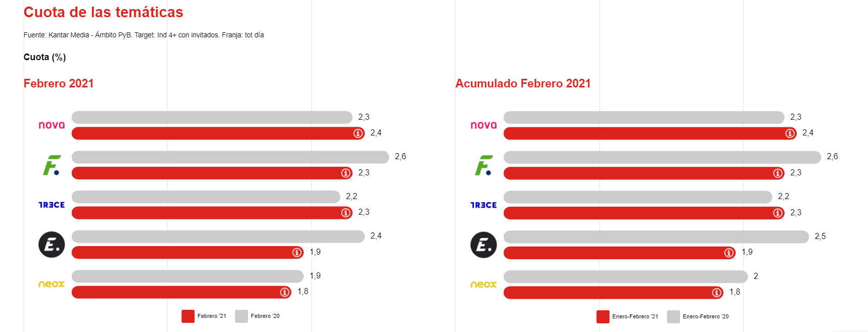 Por cadenas temáticas, Nova se posiciona como líder, con un 2,4% de cuota, seguida muy de cerca de FDF y Trece, que anotan ambas un 2,3% de share.