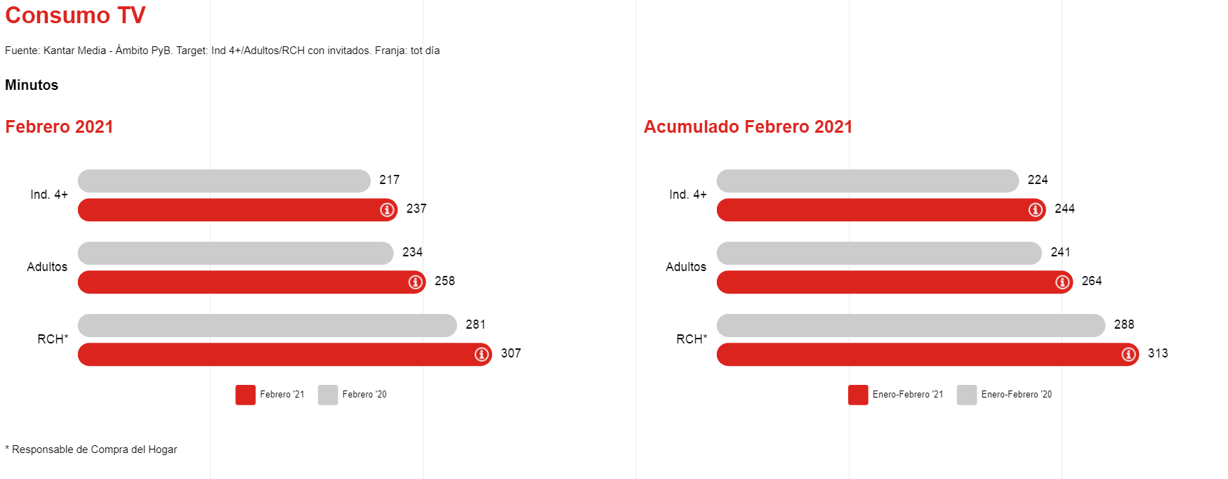 El mes de febrero de 2021 ha finalizado con una tendencia creciente en el tiempo de consumo de televisión en los distintos targets analizados. El consumo del total de televisión de la población española ha registrado una media diaria de 237 minutos, 20 minutos más que en el mismo mes del año pasado. Al realizar la misma lectura en el target adultos, el incremento fue de 24 minutos hasta alcanzar un total de 258 minutos, mientras que el target RCH (Responsable de Compra del Hogar) llegó a los 307 minutos, 26 más que en febrero de 2020.