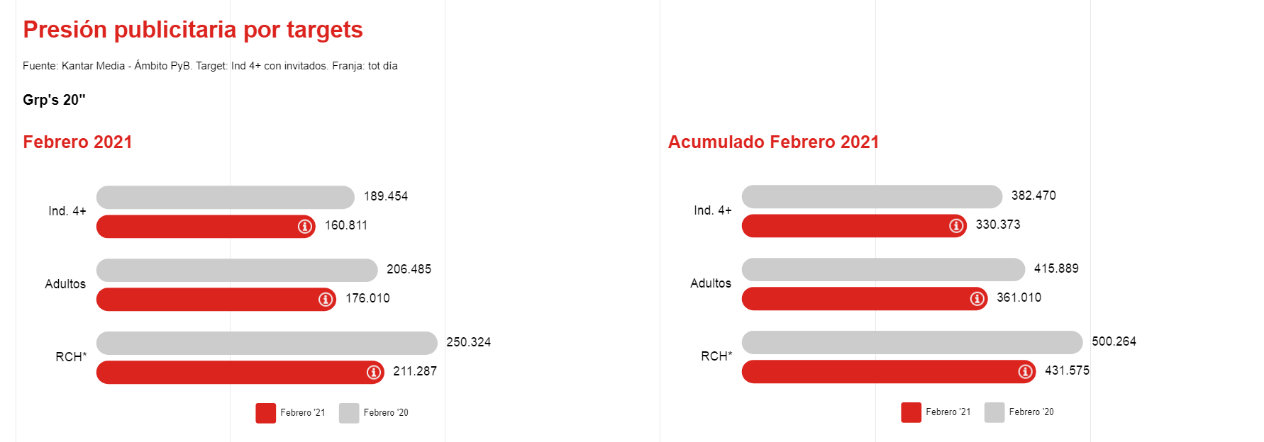 A pesar del aumento en los minutos de consumo, y tal y como ocurrió en el mes de enero, la presión publicitaria bajó, registrando todos los targets un descenso de la presión de alrededor de un 15% en GRP’s a 20”.