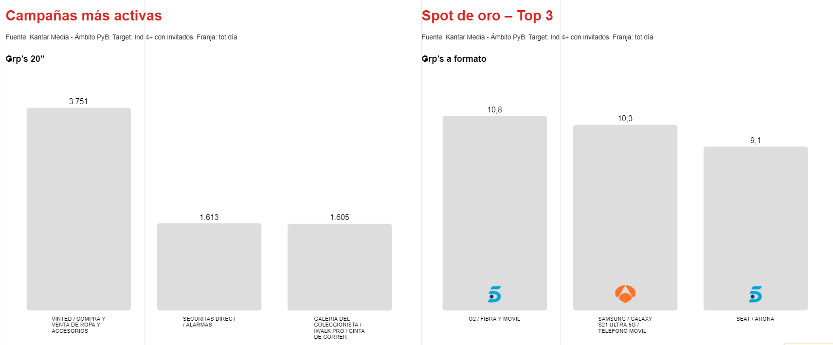 Al analizar el ranking de campañas más activas, Vinted vuelve a situarse como líder, con 3.751 GRP’s a 20”, seguido a gran distancia por Securitas Direct con 1.613 GRP’s.