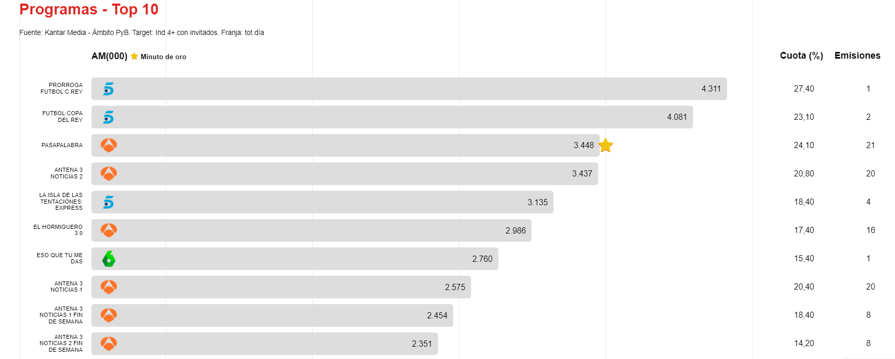 Por último, entre los programas de contenido no informativo, de nuevo destaca la prórroga del partido de Copa del Rey entre el Granada y el Barcelona, emitido en Telecinco, que alcanza una media de 4.311.000 espectadores y una cuota de pantalla del 27,4%.