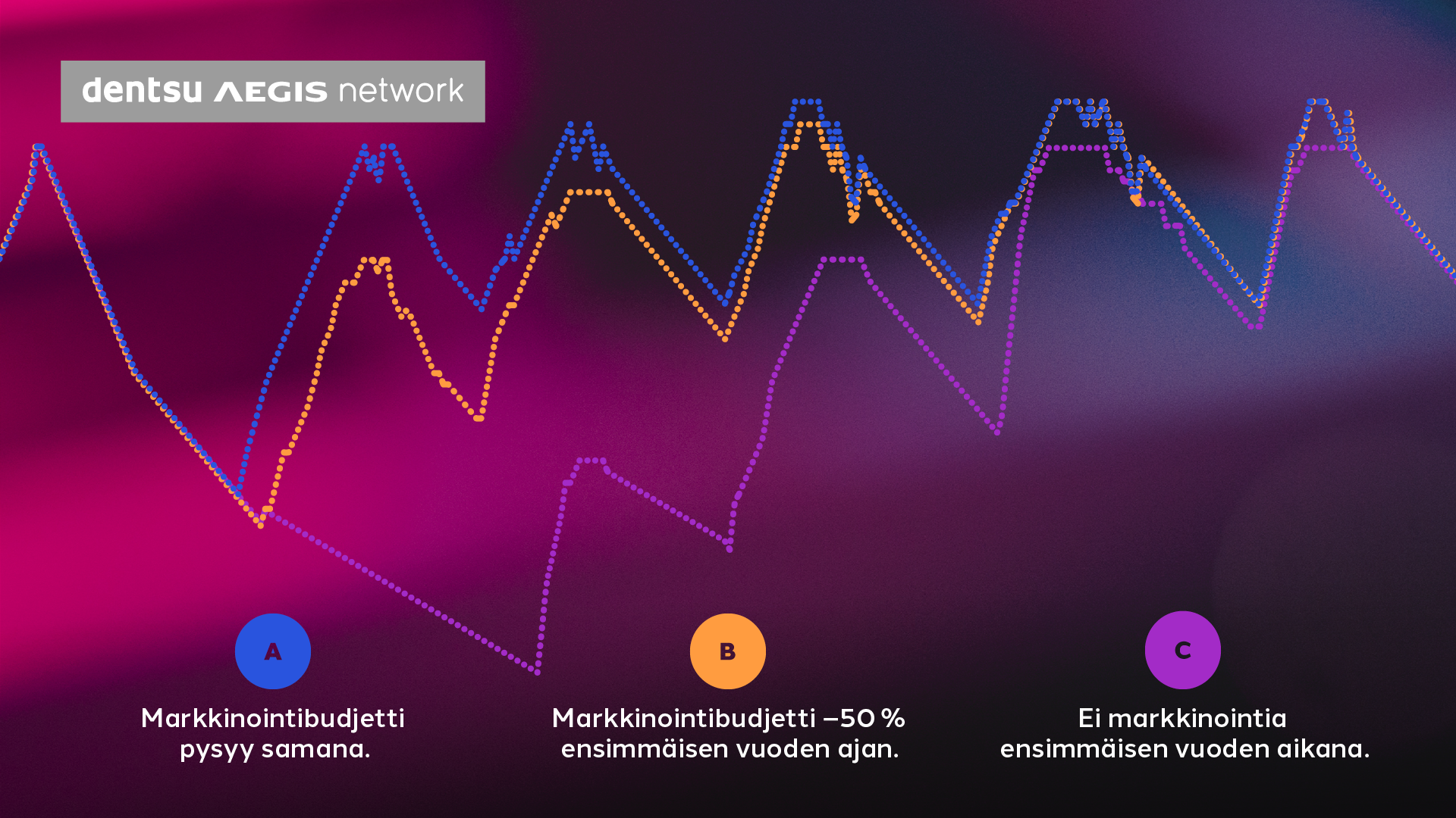 Mainosbudjetin leikkauksen pitkäkantoinen vaikutus käy ilmi Dentsun tekemässä myynninmallinnuksessa, jossa tarkasteltiin kolmea eri skenaariota. Taustalla käytettiin tietoa markkinoijan omasta sekä kilpailijoiden toiminnasta ja taloudesta sekä ympäristöstä johtuvia muuttujia.
