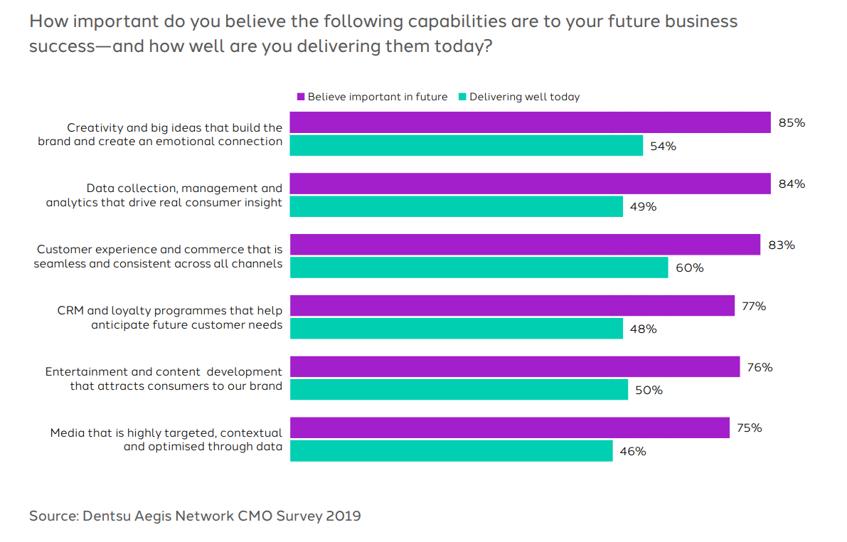 Kysyimme myös markkinointipäättäjiltä, mitä he pitivät tärkeimpinä asioina tulevaisuudessa ja mitkä ovat heidän kyvykkyytensä tällä hetkellä alueella. Data näyttää isoja aukkoja siinä, kuinka valmiita brändit ovat kohtaamaan tulevaisuuden tärkeitä haasteita.