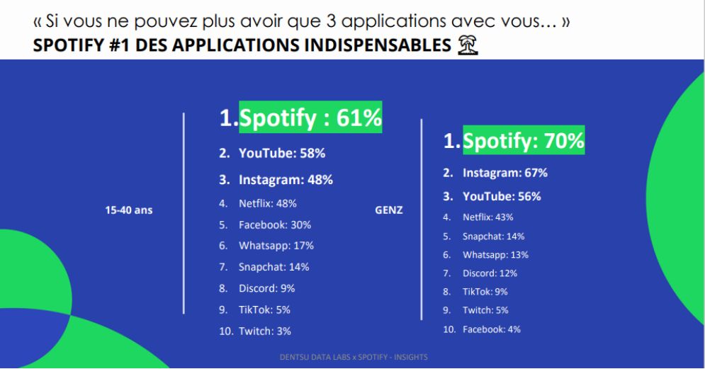Cette capacité à offrir de la « déconnexion » à son audience est probablement ce qui place Spotify en tête du classement des applications indispensables pour les 15-40 ans :