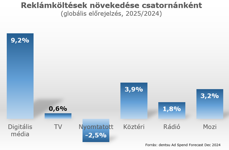 A második legnagyobb részaránnyal rendelkező, a reklámköltéseknek továbbra is több mint az ötödét közel negyedét kitevő televíziós hirdetések értéke igen marginális mértékben, 0,6 százalékkal fog bővülni 2025-ben. A csökkenéstől elsősorban a connected TV-költések 18,4 százalék feletti növekedése menti meg ezt a szektort. Eközben köztéri hirdetésekre 3,9, rádióreklámokra 1,1, mozireklámokra pedig 3,2 százalékkal fognak többet költeni a hirdetők.
