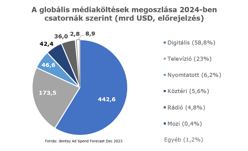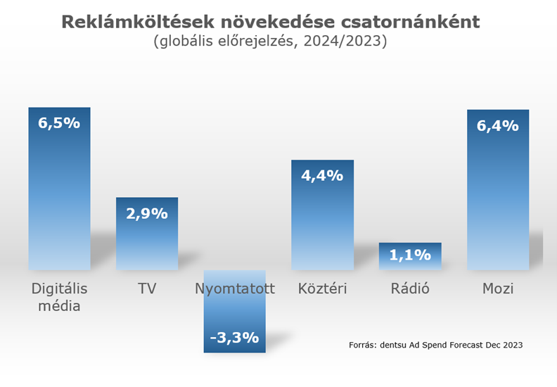 A dentsu Global Ad Spend Forecasts című elemzés adatai azt mutatják, hogy a 2023-as évre előrejelzett 2,7 százalékos bővülést követően jövőre 4,6 százalékos mértékben nőnek a globális reklámköltések. A gyarapodás egyik fő hajtóereje a hirdetési árak emelkedése lesz: azonos árakon számolva a várható növekedés mértéke 2024-ben mindössze 2,5 százalékos lenne. Ugyanakkor jelentős hatása lesz az olyan nagy politikai és sporteseményeknek is, mint az amerikai elnökválasztás, a párizsi olimpia vagy a németországi labdarúgó-Európa-bajnokság.