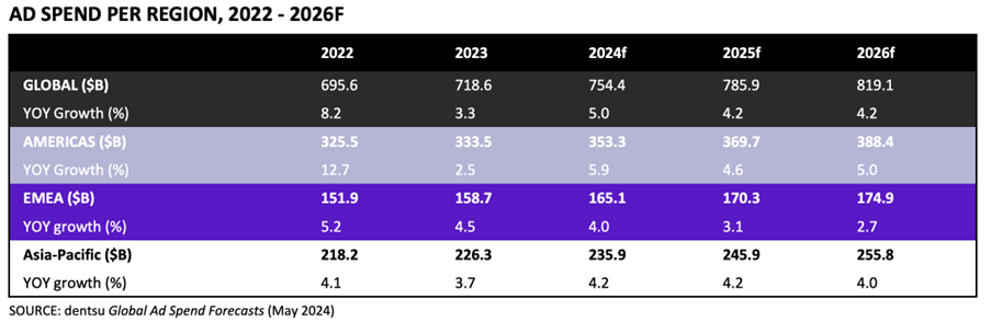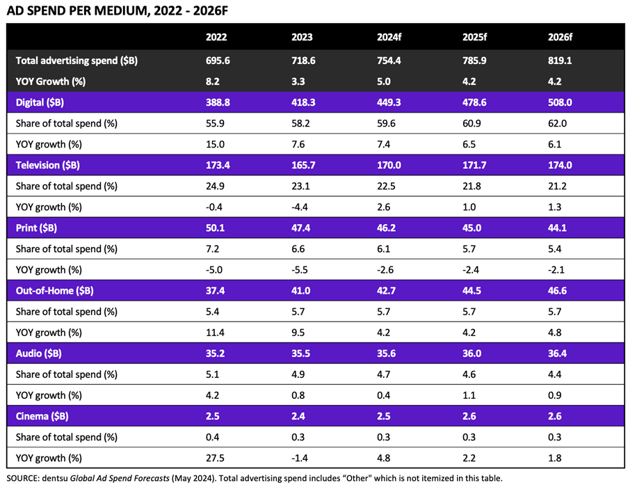 Advertising expenditure forecasts are compiled from data collated from dentsu agencies until the second half of April 2024 and based on local market expertise. Dentsu uses a bottom-up approach, with forecasts provided for 56 markets covering the Americas, Europe, Middle East, and Africa, and Asia-Pacific by medium: digital, television, print, out-of-home, audio, and cinema. Digital specifically references pure play digital platforms and does not include ad spending on the digital extensions of traditional media (e.g., digital print) which are accounted within media channel totals (e.g., digital print is accounted within print). The advertising spend figures are provided net of negotiated discounts and with agency commission deducted, in current prices and in local currency. Global and regional figures are centrally converted into US dollars at the March 2024 average exchange rate. The forecasts are produced biannually with actual figures for the previous year and latest forecasts for the current and following years all restated at constant exchange rates.