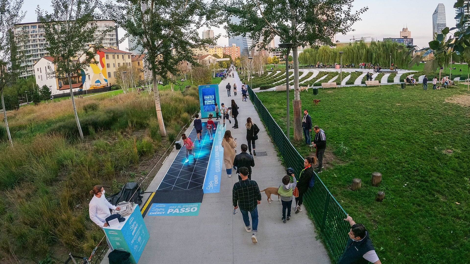 All’evento le persone hanno potuto scoprire l’energia generata dai propri passi, interagendo con una pedana dotata di una tecnologia capace di visualizzare e trasformare quell’energia in un messaggio che si componeva gradualmente, passo dopo passo.