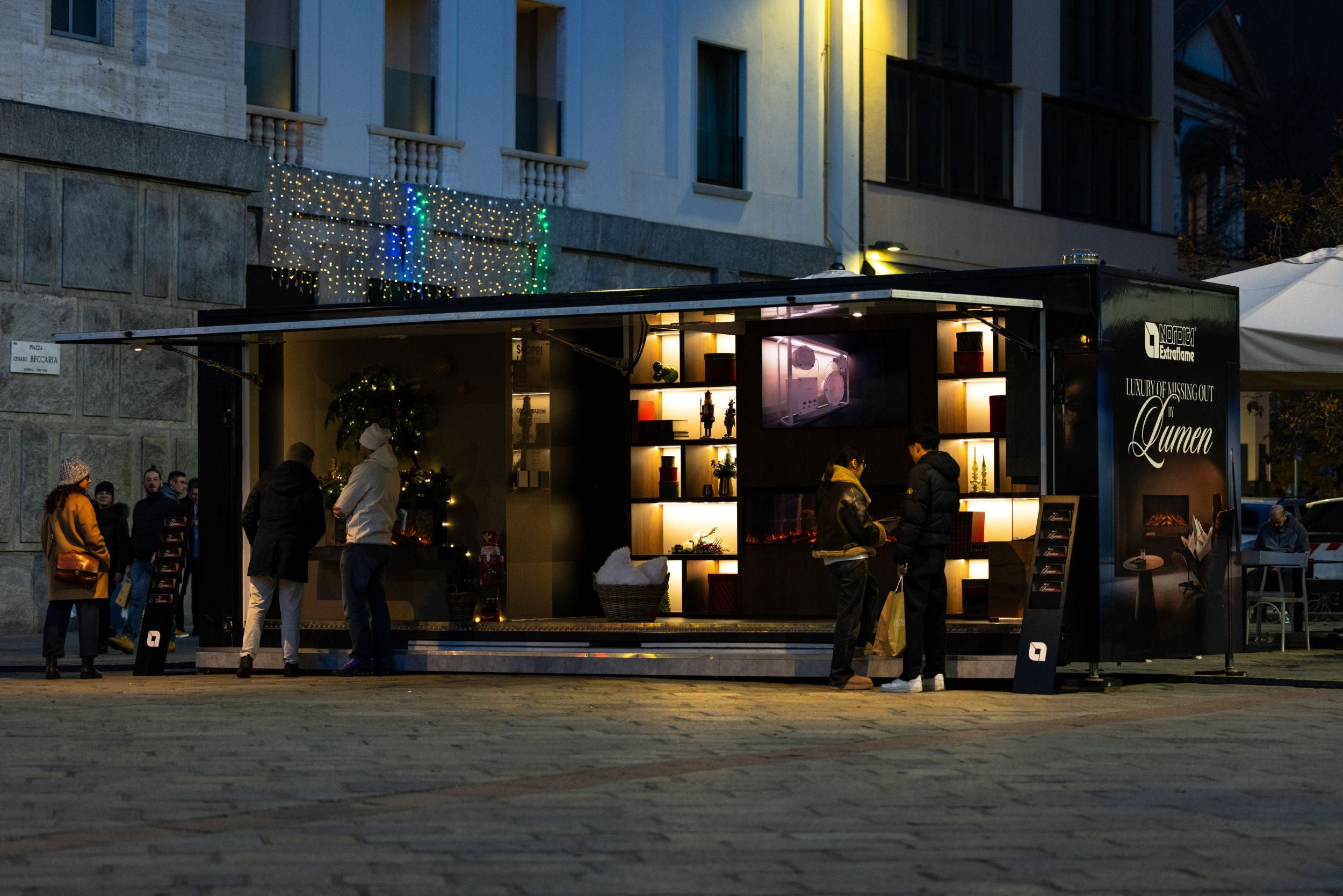 Alla base di un grande abete illuminato, Lumen diventa il simbolo dell’incontro tra tradizione e contemporaneità. In parallelo, in Piazza Cesare Beccaria nasce un pop-up con salotto immersivo dove vivere un momento di relax e benessere nel cuore della città.