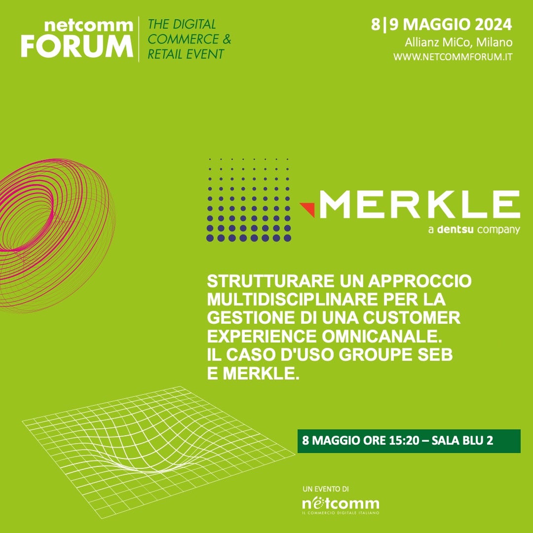 Merkle Italia, l’agenzia di Customer Experience Management (CXM) di dentsu guidata da Matteo Nisi, anche quest’anno è presente l’8 e 9 maggio alla XIX° edizione del Netcomm Forum, presso il MiCo di Milano, sia come espositore, sia come protagonista di due workshop.