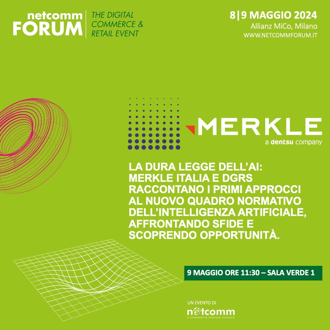 Nel secondo workshop dal titolo: “La dura legge dell’AI: Merkle Italia e DGRS raccontano i primi approcci al nuovo quadro normativo dell’intelligenza artificiale, affrontando sfide e scoprendo opportunità”, il 9 maggio alle 11.30 nella Sala Verde 1, un selezionatissimo panel di esperti della materia composto da Matteo Nisi Managing Director Merkle, Alessia Zerbini General Counsel Southern Europe & Turkey dentsu, Giulia Sala DGRS Partner, illustra implicazioni etiche e legali dell’AI. Oltre alla expertise di Merkle in ambito AI, viene presentata sul palco la profonda esperienza del team Legal di dentsu, che permette di gestire complessi progetti di marketing e comunicazione, sfruttando al massimo tutte le ultime opportunità tecnologiche.