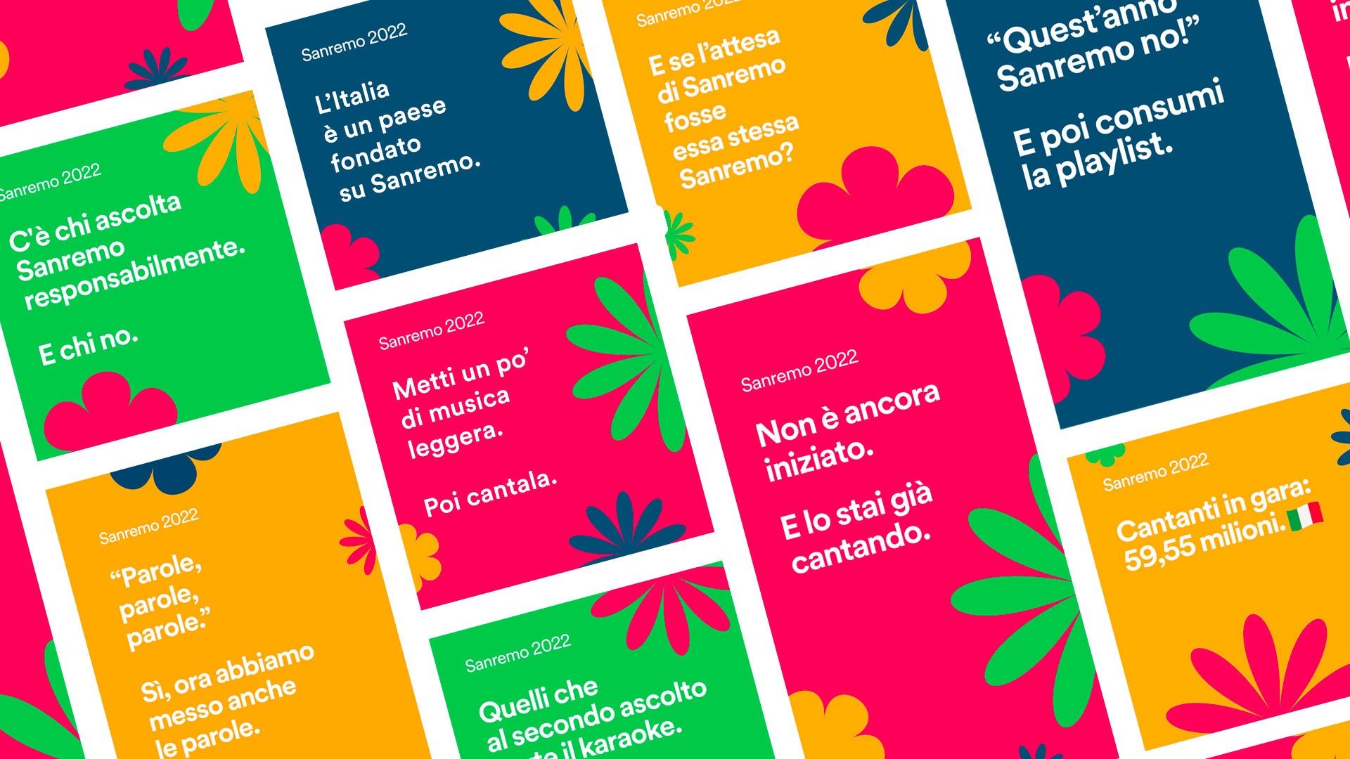 Lo spot poi chiude con l’invito ad ascoltare la nuova playlist di Sanremo 2022: https://open.spotify.com/playlist/37i9dQZF1DWVQfeA9N7Q0g