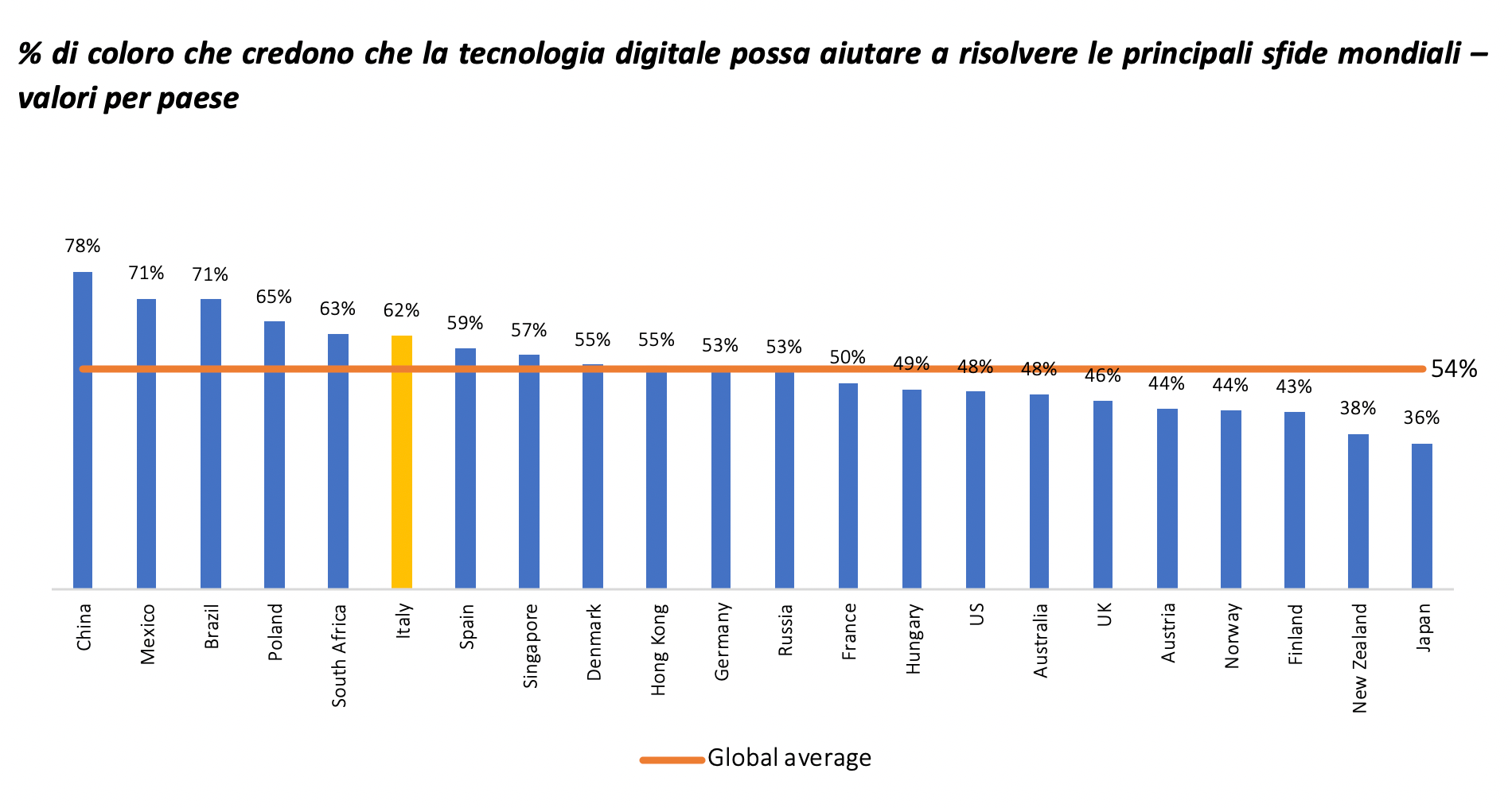 Quello che appare evidente è che le nuove esigenze hanno sviluppato una maggiore apertura e consapevolezza nei confronti della digitalizzazione. Quella sorta di “esperimento sociale di massa”, con pochi precedenti nella storia, a cui abbiamo partecipato, ci ha lasciato un’eredità importante: molti si sono affidati e si stanno affidando tuttora alla tecnologia come vera e propria ancora di salvataggio. Ed ecco spiegata la crescita di coloro che credono nella capacità del digitale di risolvere le grandi sfide della società, come salute, povertà, degrado: siamo passati dal 42% del 2018 al 54% del 2020. Dato record per l’Italia, sesta nel ranking mondiale (62%), sintomo ancora una volta della profonda fiducia nella digitalizzazione del nostro paese.