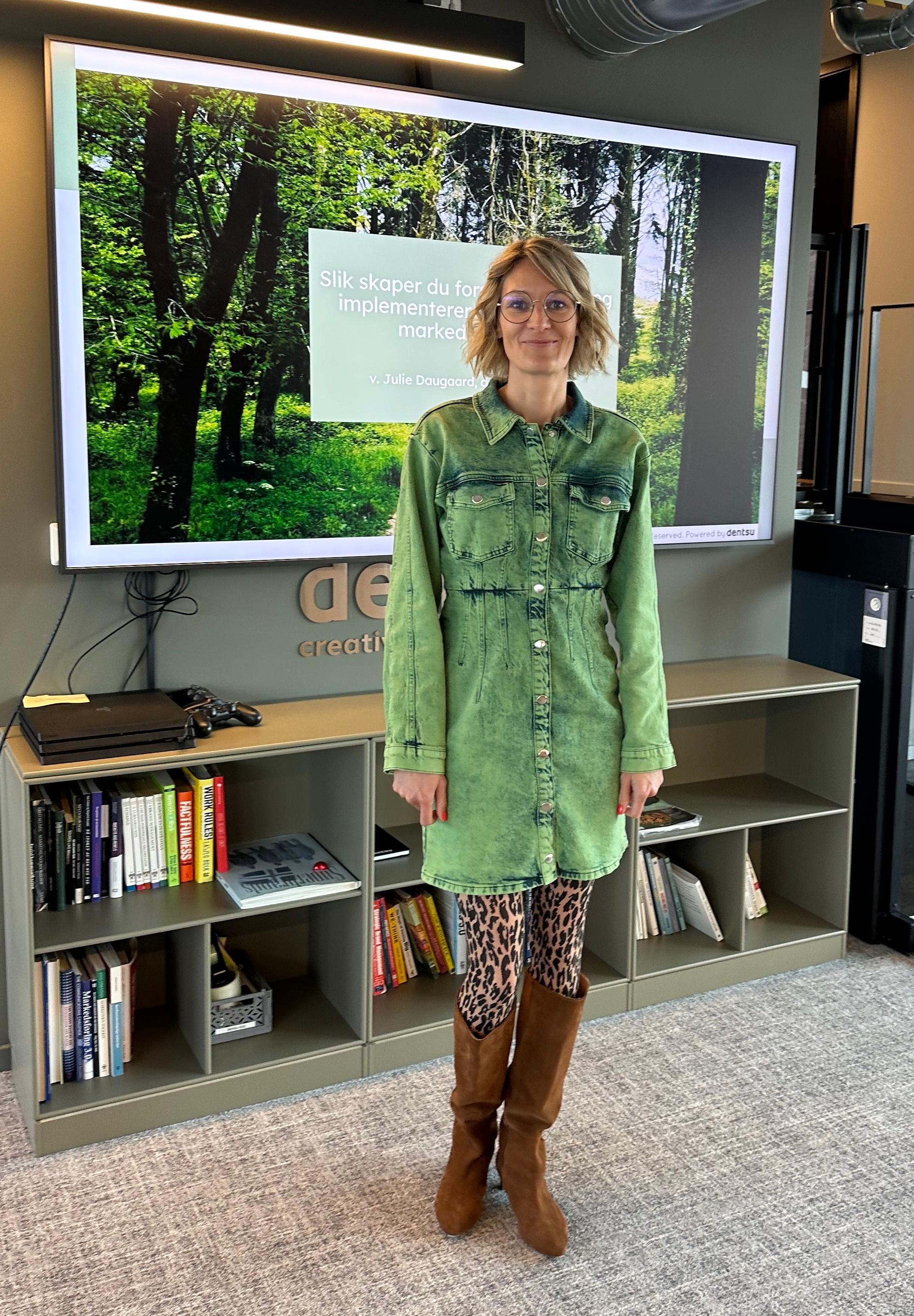 Julie Daugaard er direktør for bærekraftig vekst i dentsu Danmark. Og nettopp bærekraft er det som har gjort Julies stemme kjent. Hun har jobbet i dentsu i 10 år, og de siste fire årene med bærekraft. Da hun nylig var på besøk i Norge holdt hun flere foredrag om dette internt og for våre største kunder, og da er jo spørsmålet – hvordan kan hun kombinere bærekraft med å “pushe produkter”?