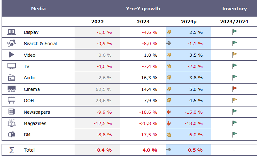 TV vil fortsatt ha en nedgang basert på fallende seing som ble 5 minutter mindre pr dag i 2023, samtidig som etterspørselen etter annonseplass ikke er like stor. Det som er interessant å observere er at TV fortsatt er veldig bra for dekning og har stor gjennomslagskraft, og samtidig blir reklamefilmene stadig kortere, snittet er nå på 21 sekunder. Radio, Kino og Utendørs vil få en pen oppgang, og blant disse har spesielt utendørs jobbet med nye løsninger. Det er høy digital produktutvikling, med økning i data-assisterte kjøp, og spennende kreative løsninger. Aviser, magasiner og DM vil nok dessverre fortsette sin relativt kraftige nedgang.