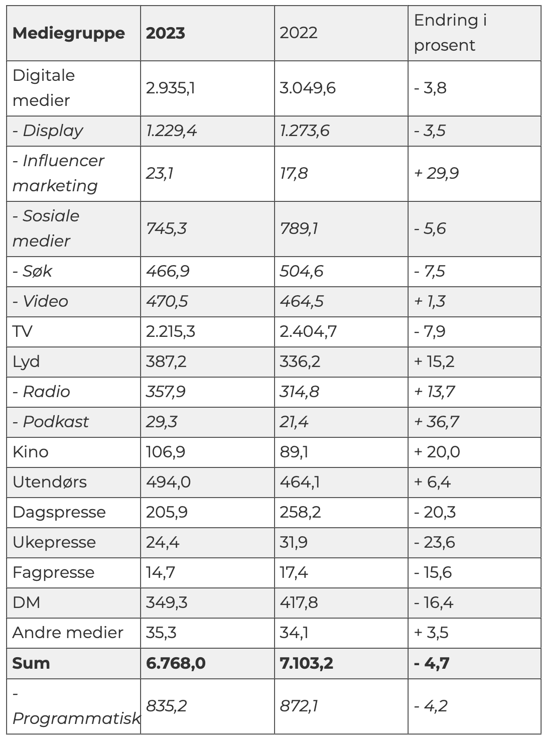 Den andre store mediekanalen, digitale medier, går tilbake 3,8 prosent. Det utgjør en reduksjon 114,5 millioner kroner.