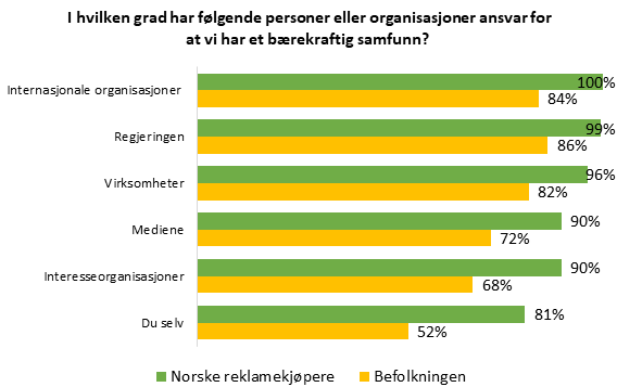 Reklamekjøperne skiller seg også fra gjennomsnittsnordmannen ved at de i langt større grad mener at «alle» har et ansvar for at vi har et bærekraftig samfunn. Hele 96% av reklamekjøperne mener at virksomheter har et slikt ansvar mens 90% også peker på mediene.