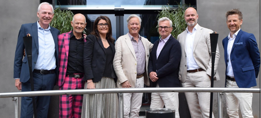 Carat-sjefer: Her ser du så godt som alle de norske byrålederne i Carat opp gjennom de siste 50 årene. Fra venstre Tore Eidholm, Peter Jetzel, Fiona Lloyd, Helge Onsum, Eldar Skylstad, Stian Jansen og Pelle Stensson. Fredrik Fjeldstad var forhindret fra å være med på festen. Foto: Knut Kristian Hauger.