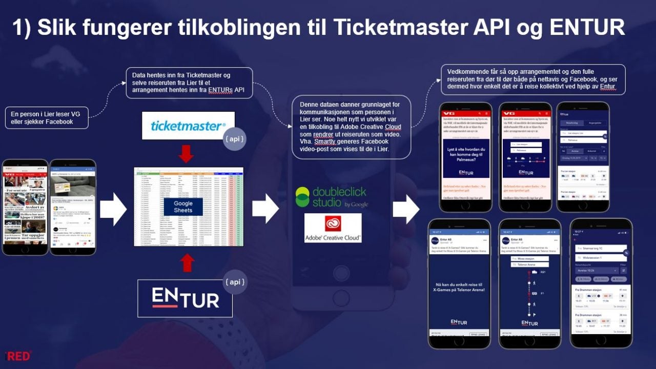 Ticketmaster er den desidert viktigste aktøren på dette området, vi inngikk derfor et data-samarbeid med dem. Dermed kunne vi gjennom en API-tilkobling daglig hente ut en oversikt over alle kommende arrangementer i de største norske byene.