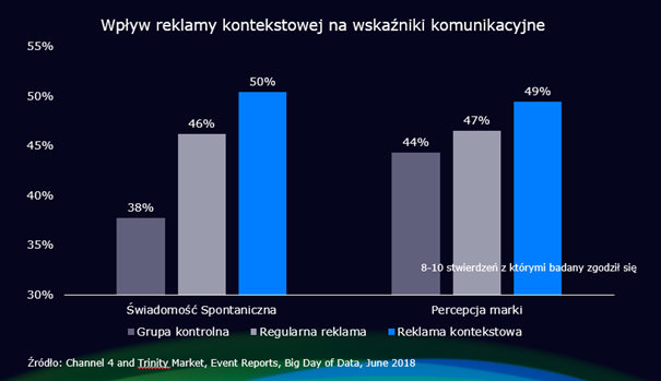 Można sobie zadać pytanie, czy istnieją badania potwierdzające skuteczność wykorzystywania kontekstu w programach TV. Bardzo ciekawe badanie w tym temacie przeprowadził Channel 4 w Wielkiej Brytanii w 2018 r., dopasowując reklamy w przerwie reklamowej do kontekstu programowego sprzed chwili. Przykładowo, jeśli bohater programu lub serialu pił wodę w trakcie uprawiania sportu, automatycznie w breaku reklamowym po tej scenie pokazywano reklamę izotoniku. Wyniki eksperymentu przeprowadzanego na próbie prawie 2 tys. osób i badaniu 9 marek jednoznacznie wskazują na przewagę reklamy lokowanej kontekstowo.