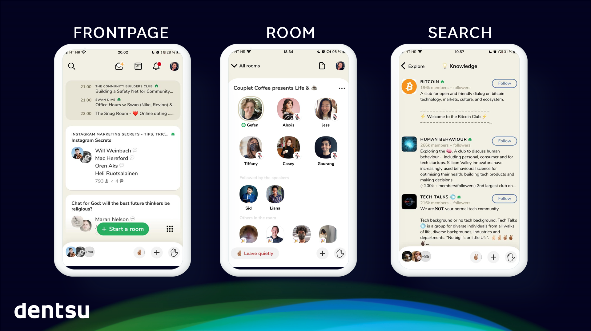 You need to be invited to be in by an existing member. In the app you can enter different rooms where discussions are going on. Rooms differ from local communities to interest based and issues from hot marketing topics to religion, history, hobbies, entertainment or anything under the sun. You can also start your own room or schedule it for the future.