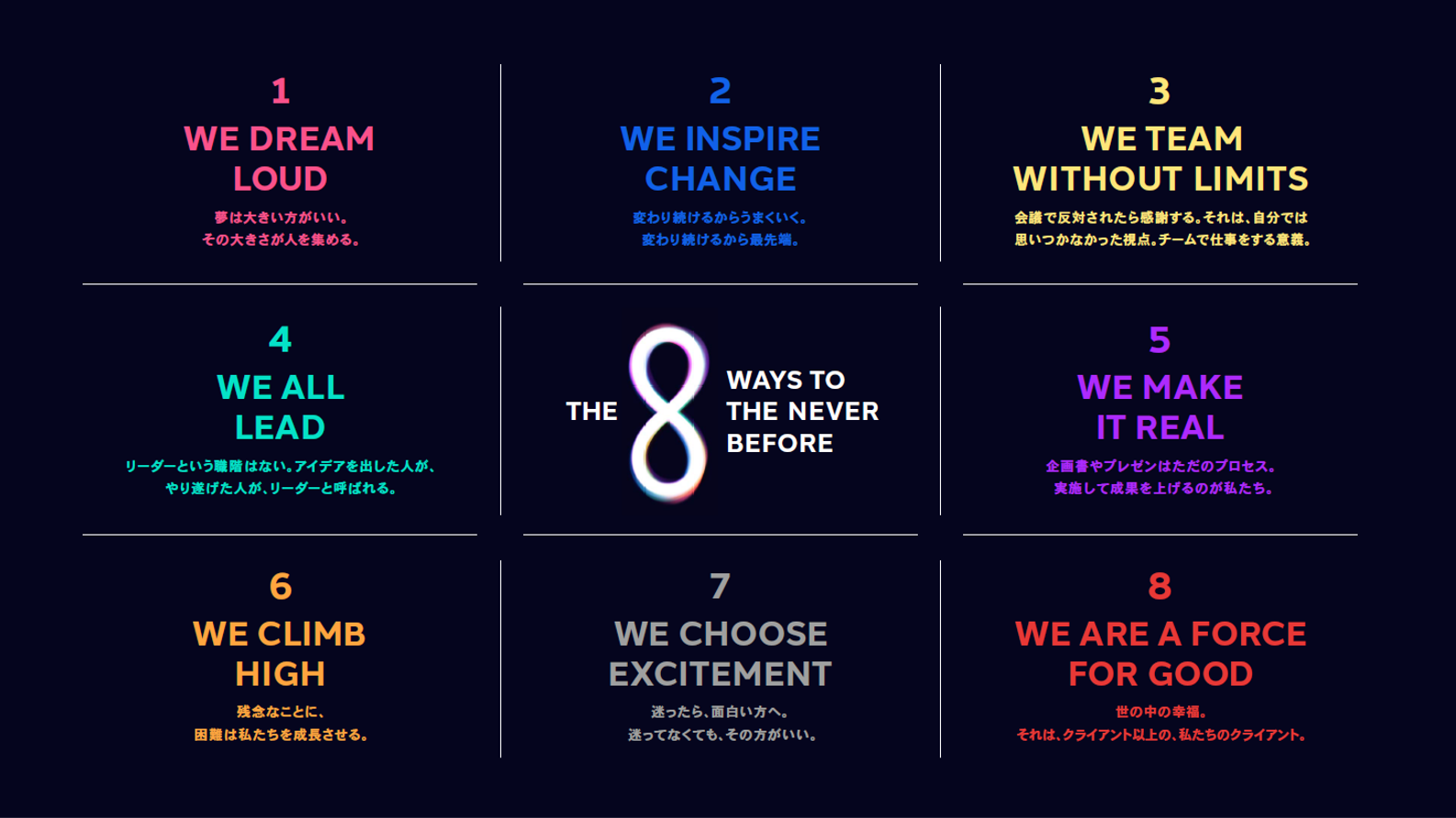 In 2020, when we refreshed our brand to be ‘just’ dentsu, we introduced a new vision, invitation to the never before. It directs us to be optimists about the future and always focus on innovations for our clients, but also finding ways to improve our own internal operations all the time. Our values are our 8 ways on getting to the never before.