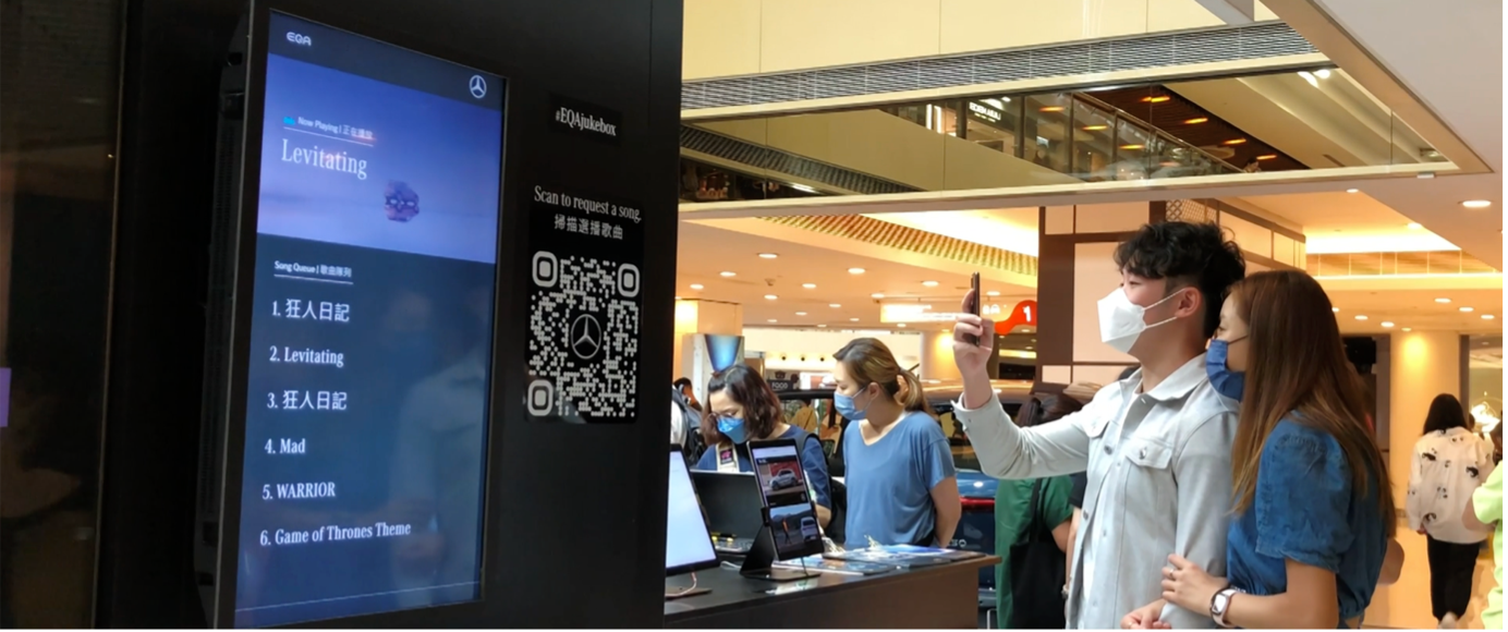 To complete the campaign, the experience was taken online. While the audiences enjoyed the electric dance and the EQA display up-close and safe through a massive jukebox, they could pick their favourite songs to “electrify” through scanning the QR codes and entering a WhatsApp chatbot and an AR app allowed them to get up close and look at the car from every angle. The experience was launched in a popular shopping mall in Hong Kong.