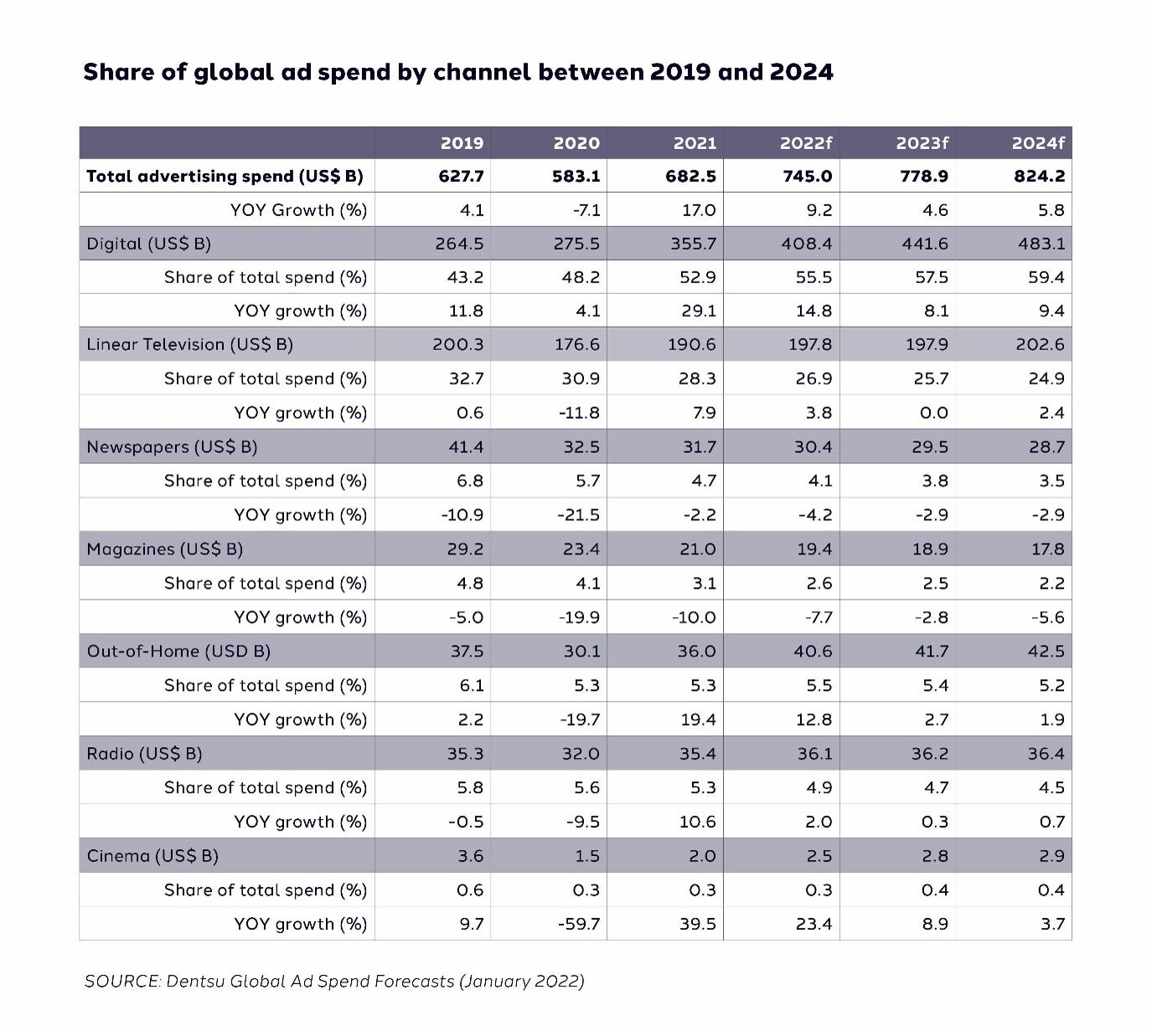 Advertising expenditure forecasts are compiled from data collated from dentsu brands until the second half of December 2021 and based on local market expertise. Dentsu uses a bottom-up approach, with forecasts provided for 59 markets covering the Americas, Asia Pacific and EMEA by medium: Digital, Linear Television, Print, Out-of-Home, Radio & Cinema. The advertising spend figures are provided net of negotiated discounts and with agency commission deducted, in current prices and in local currency. For global and regional figures, figures are centrally converted into USD at the November 2021 average exchange rate. The forecasts are produced bi-annually with actual figures for the previous year and latest forecasts for the current and following years all restated at constant exchange rates.