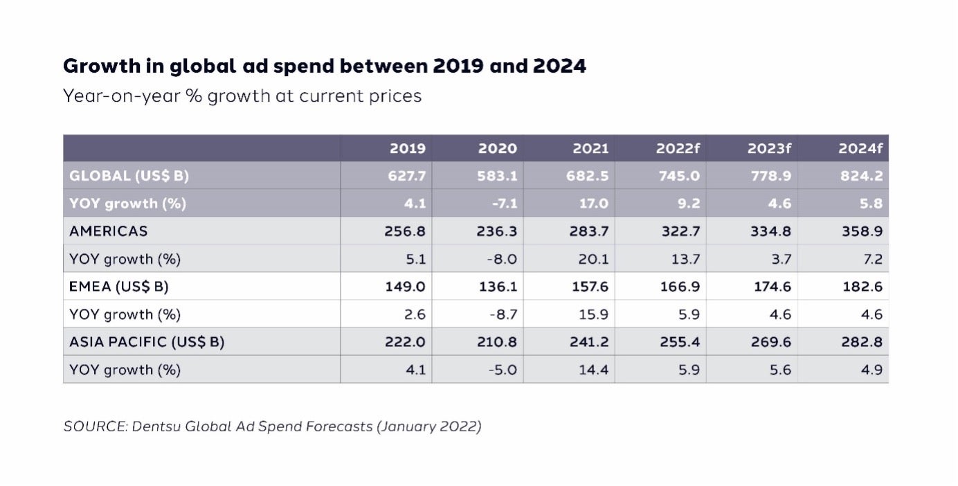 - Asia Pacific advertising spend is expected to grow by 5.9% (vs global 9.2%) to reach US$255 billion (vs US$745 billion globally) in 2022 – US$33 billion above the 2019 pre-pandemic level in the region