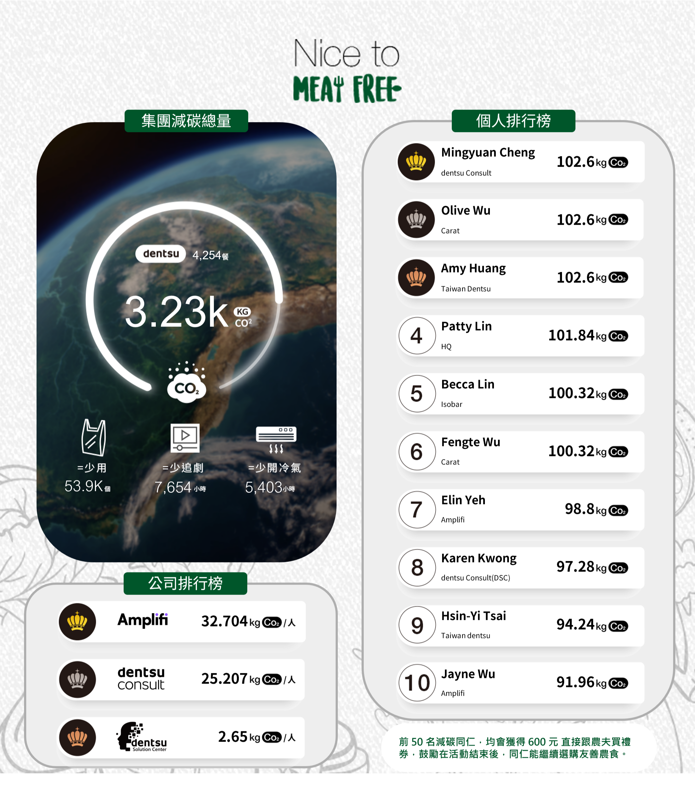 此外,電通也透過內部永續沙龍提升同仁永續意識,並以「Nice to Meat Free」每日一餐蔬食行動,單月累積 3 萬餐、減碳逾 2.5 萬公斤,成為企業示範低碳行為的成功案例。