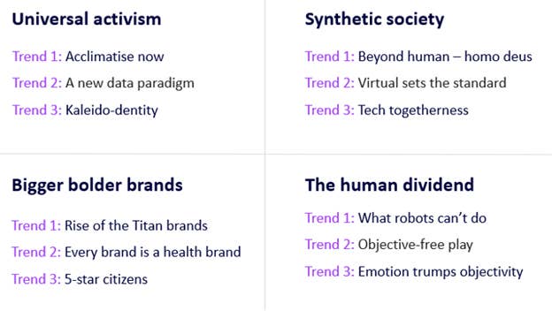 The four macro themes are: universal activism, synthetic society, bigger bolder brands and the human dividend. The report also included an imagined pathway with hypothetical key events between now and 2030, to illustrate how we may get there.