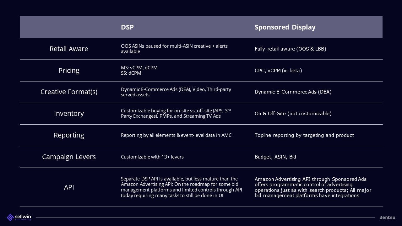 If you’re currently not running any display, you may be wondering which product is right for you. For brands just starting out, Sponsored Display may be the right fit for an initial display test and then consider Amazon DSP when ready to scale further. Sponsored Display can also be more effective for brands that have persistent inventory challenges. While Amazon DSP can be retail aware for out-of-stock products, it is not set up to prevent brands from driving advertising to detailed pages when losing the buy box. Sponsored Display accounts for both, just as Sponsored Products does, and can minimize advertising dollars wasted and the manual stopping and starting of campaigns.