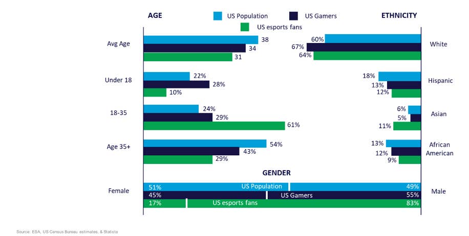 It’s worth first establishing the difference between eSports and gaming. Gamers or gaming enthusiasts are individuals who enjoy an array of titles, which can range from single player to multiplayer, and which may or may not have a competitive element to them. eSports often takes the form of organized, multiplayer video game competitions, particularly between professional players, individually or as teams. While gaming appeals to a broader, more gender-balanced population, eSports is male and millennial-concentrated.