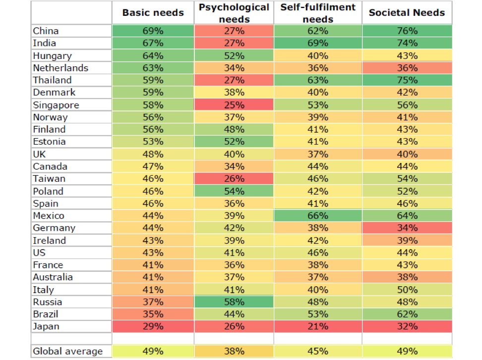 Fifty-seven percent of U.S. to feel their basic needs (digital access and trust in data use) are not well addressed. This is higher than the global average of 51%. In regards to self-fulfilment (skills, education and jobs), 46% of Americans felt digital was meeting their needs which was on par with the 45% global average. The U.S. was, however far more poisitive about their societal needs being met (44% felt this was true compared to only 32% globally.) Still, the study revealed widespread concerns: