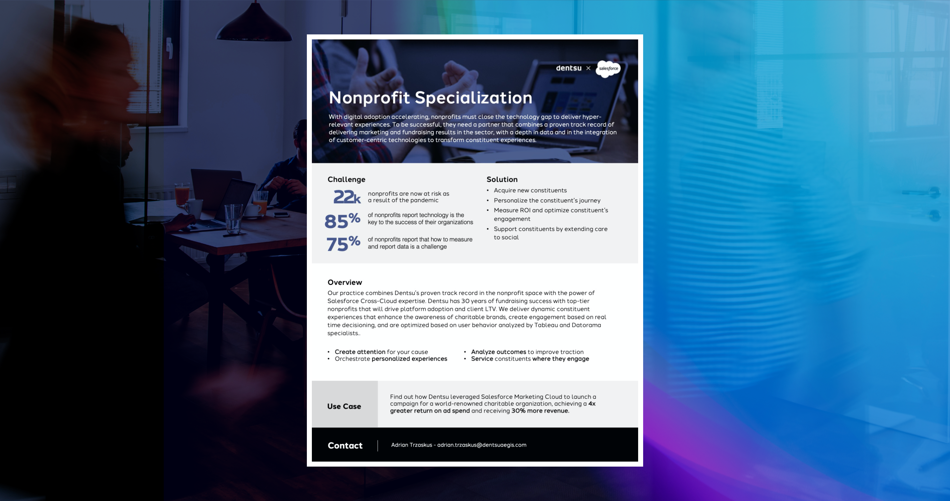 This solution leverages Salesforce offerings such as Journey Management, Interaction Studio and insights powered by Tableau and Datorama to enable non-profit organizations to create attention, deliver personalized experiences and nurture and analyze constituent engagement.
