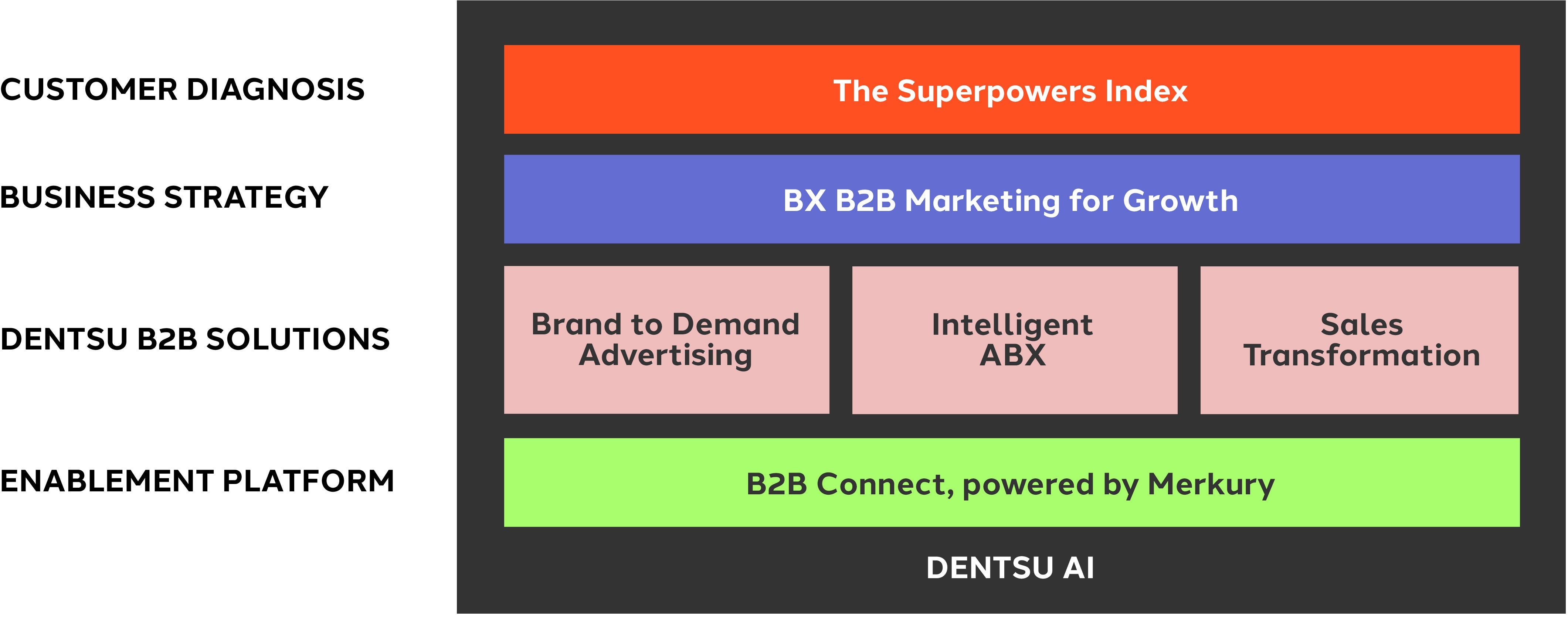 The values and behaviors of the modern B2B buyer are changing. To succeed, brands need to navigate the traditionally siloed worlds of marketing and sales to deliver a connected experience which resonates with buyers' personal values. However, many brands are struggling to adapt to the pace of change, often coming up short of these expectations. Dentsu is uniquely positioned to rewrite the playbook for B2B. Dentsu B2B connects marketing, sales and customers - creating experiences that grow business and drive revenue growth.