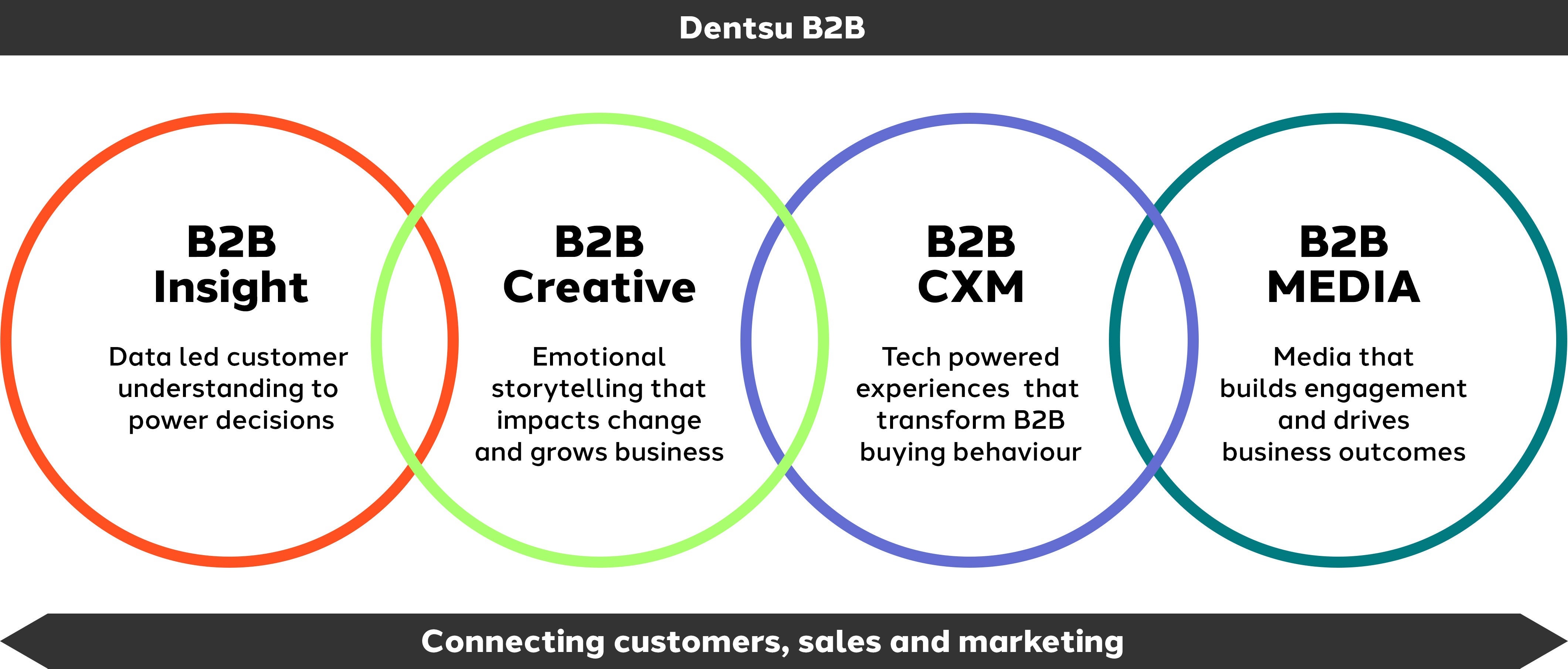 Our dentsu B2B global teams bring deep subject matter expertise across insight, creative, customer experience management and media. We create integrated teams around our client requirements, all in service of connecting customers, sales and marketing groups.