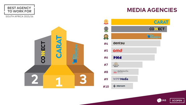 Carat South Africa has been named Best Media Agency to Work for in South Africa by SCOPEN, a recognition that speaks directly to who we are and what we stand for as a business.