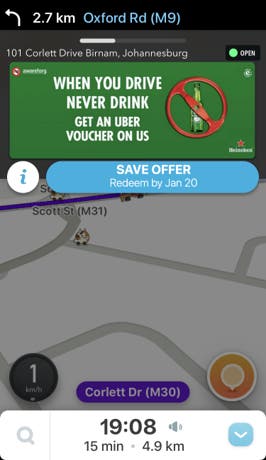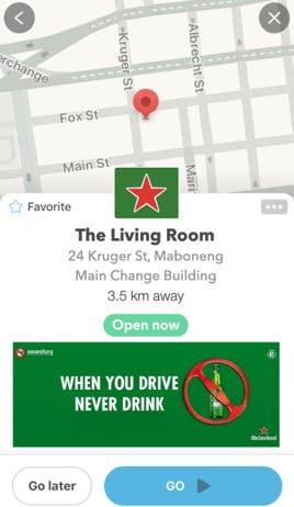 100 key Heineken outlets were identified and plotted on Waze. Within our first identifiable moment, users searching for these outlets were made aware of the dangers of drinking and driving, before even navigating to the outlet.
